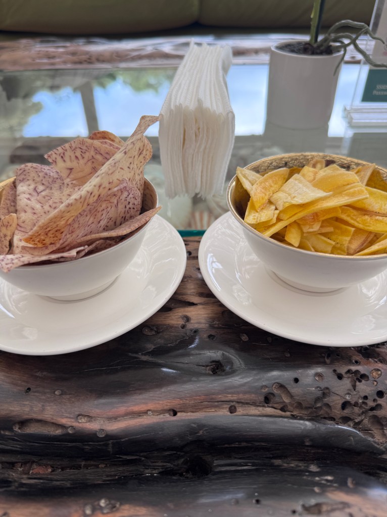 The last stop on the tour was the dining area. It was so calm and peaceful-set on a lagoon the ambiance felt like I had stepped in to another dimension. I was served fresh passion juice and mango juice and had arrowroot and plantain crisps brought out. It was enough to make me call my daughter and friends to join me for dinner.